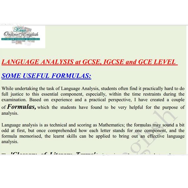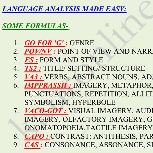 While undertaking the task of Language Analysis, students often find it practically hard to do full justice to this essential component, especially, within the time restraints during the examination. Based on experience and a practical perspective, I have created a couple of Formulas, which the students have found to be very helpful for the purpose of analysis.